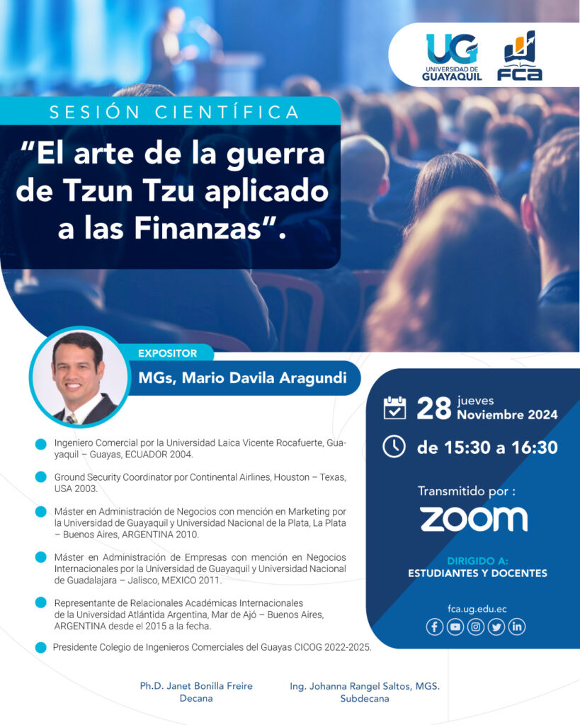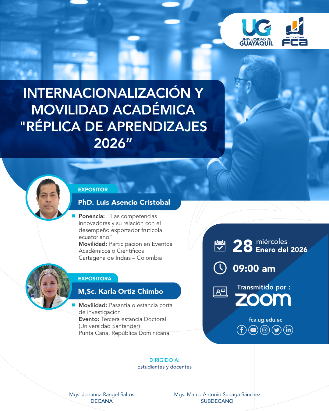 Recursos para estudiantes Recursos para docentes Biblioteca Oferta Académica Noticias Infórmate de todo lo Académico Réplica de AprendizajeRéplica de AprendizajeLeer más Ene 23, 2026 Réplica de AprendizajeRéplica de AprendizajeLeer más Ene 23, 2026 Workshop de Comercio ExteriorWorkshop de Comercio ExteriorLeer más Ene 22, 2026 ENCUESTA A GRADUADOS Oct 7, 2025 Ver más Potencialización del turismo en las rutas agroalimentarias Sep 8, 2025 Ver más HORARIOS DE EXÁMENES 2025- 2026 C1 Jul 9, 2025 Ver más Exámenes de Primer Parcial 2025-2026 CI May 15, 2025 Ver más Maestría en Negocios Internacionales Feb 6, 2025 Ver más Exámenes de Segundo Parcial y de Recuperación 2024-2025 CII Ene 7, 2025 Ver más Periodo Académico CII 2024-2025 Dic 11, 2024 Ver más El arte de la guerra de Tzun Tzu aplicado a las Finanzas Nov 26, 2024 Ver más Horarios de exámenes 1er. Parcial Ciclo II 2024 – 2025 Nov 22, 2024 Ver más Horarios y Distributivos Tutores para el proceso de Integración Curricular y Titulación 2024-2025 T2 Justificación de Inasistencias y Solicitud de Instrumentos de Evaluación atrasados Horarios de Exámenes 2025- 2026 C2 Dic 9, 2025 Ver más Estudiantes Docentes Administrativos Carreras